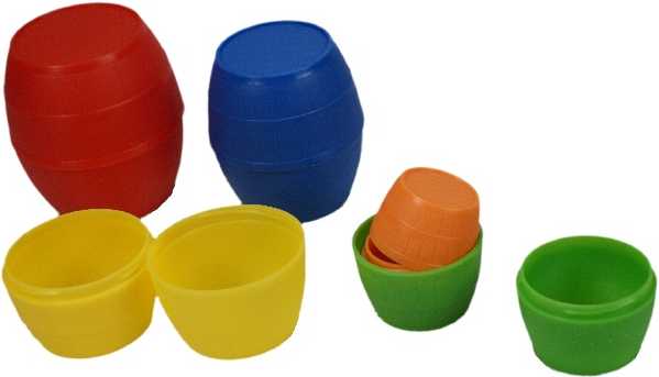 Klasszikus műanyag építőjáték egymásba és egymásra rakható hordókkal. Az 5 db hordó egyszerű csavaró mozdulattal kettéválasztható. A legnagyobb hordó mérete: 8 x 9 x 8 cm. A hordókkal számos érdekes játékot játszhatnak a kicsik.