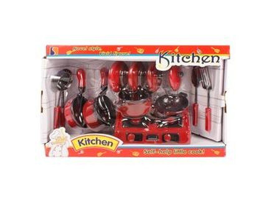 Süsd és főzd meg a legjobb ételeket a piros edényekben! A 13 darabos edénykészlet tűzhellyel csomagban egy két gázrózsás tűzhelyet találsz, amin szinte bármilyen ételt el tudsz készíteni. A csomagban serpenyő, lábosok is megtalálhatók, megfelelő méretű fedőkkel, lapátokkal és szedőeszközökkel is. A 13 darabos edénykészlet tűzhellyel bármilyen játékkonyhával is együtt használható. Csomagolás méretei: 42 x 10 x 26 cm.