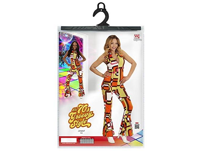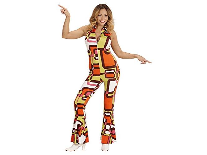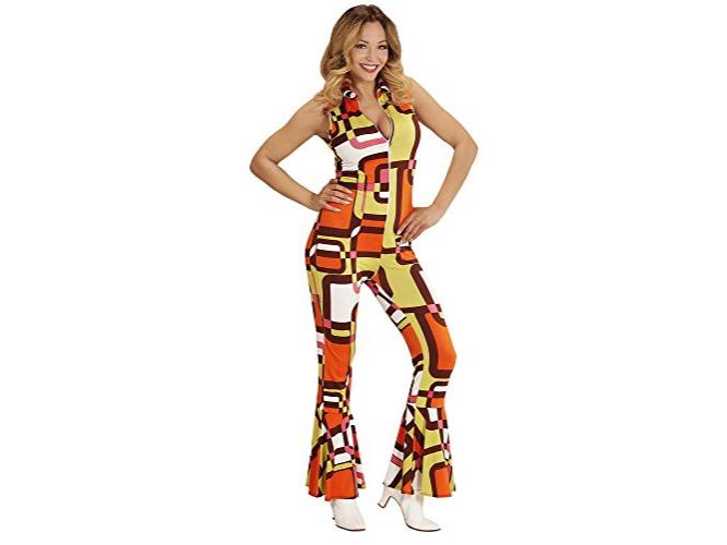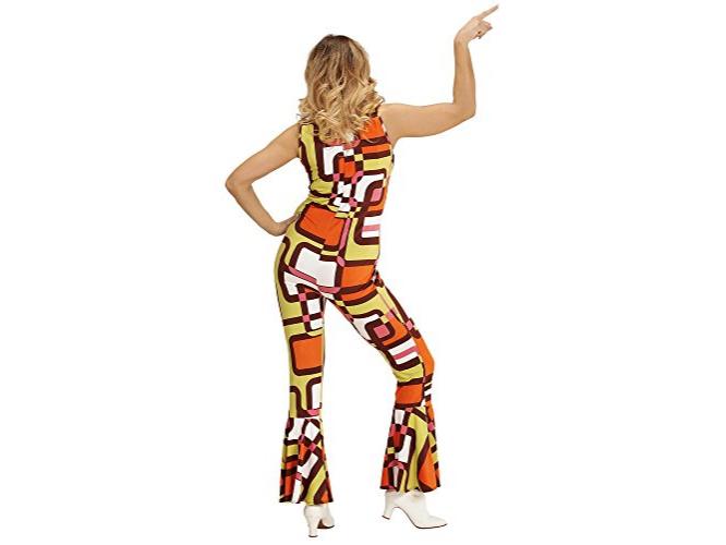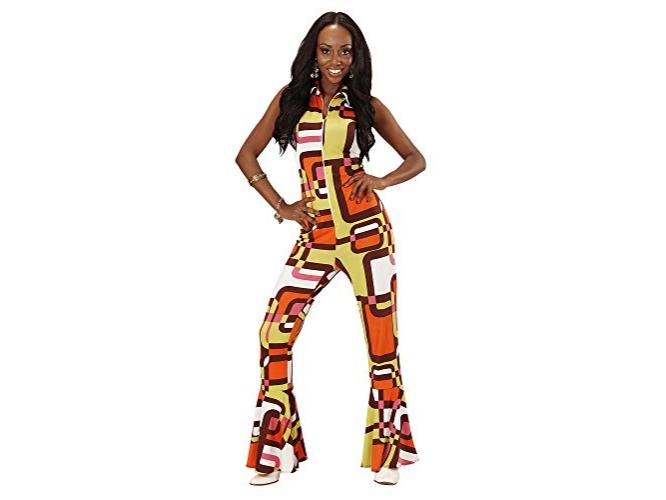 A 70 es évek retró kezeslábas csöves mintával női jelmez leírása: