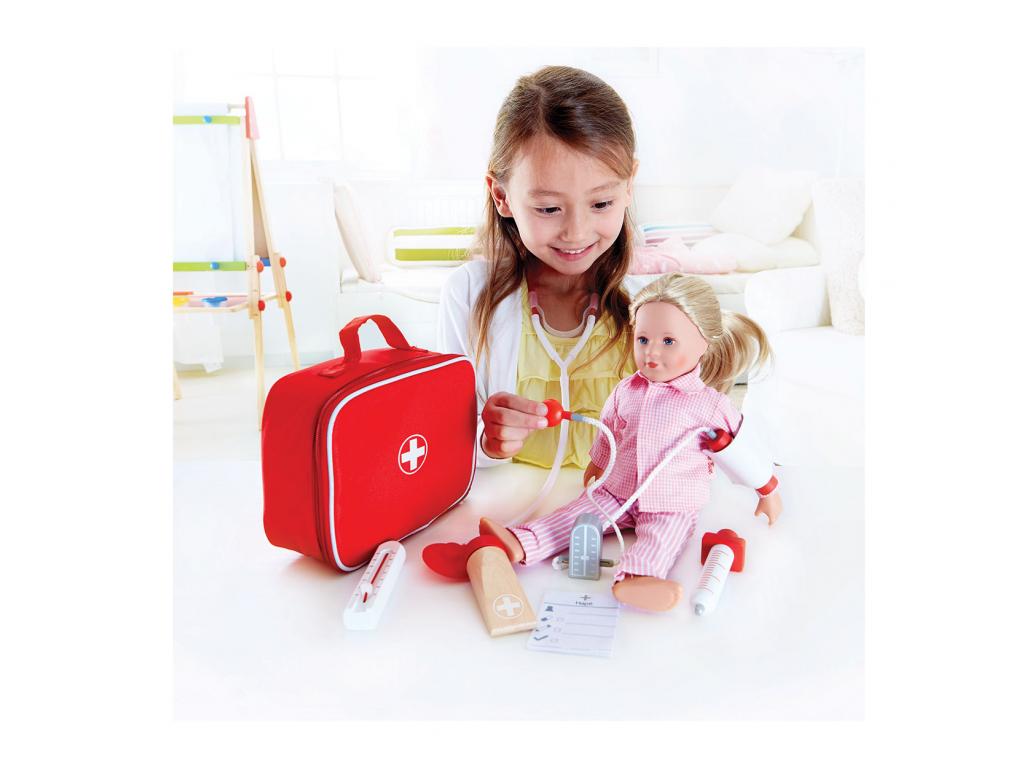 Hape orvosi szett, melyben minden kis doktor megtalálja amire szüksége van: hőmérő, sztetoszkóp, gyógyszer, vérnyomásmérő, szuri, mindez egy praktikus hordtáskában.