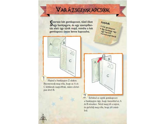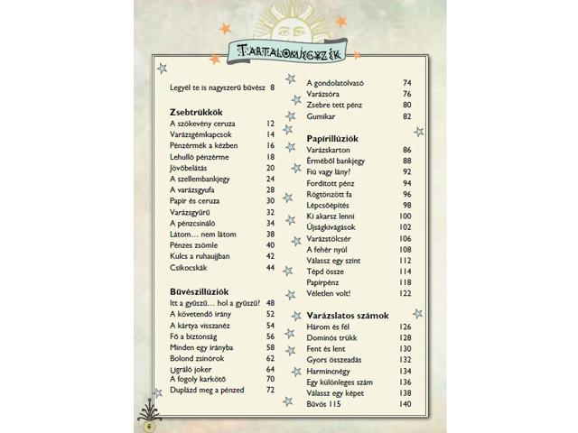 A bűvészek világa tele van rejtélyekkel, melyeket nem tanulhatsz meg csak úgy. Kell hozzá egy bűvészkönyv, amiben minden trükköt megtalálsz. Ez a könyv több mint 200 oldalon tartalmaz trükk leírásokat, melyekhez még képeket is találsz, hogy könnyebben megértsd. A könyveb az egyik legjobb dolog, hogy csak olyan tárgyak kellenek hozzá, amiket a háztartásban is biztosan megtalálsz. Tanuld meg a trükköket, és akár otthon a családodnak, akár egy Ki mit tud? rendezvényen add elő azokat, mókás hangulatban, és hidd el hatalmas sikered lesz a végén.