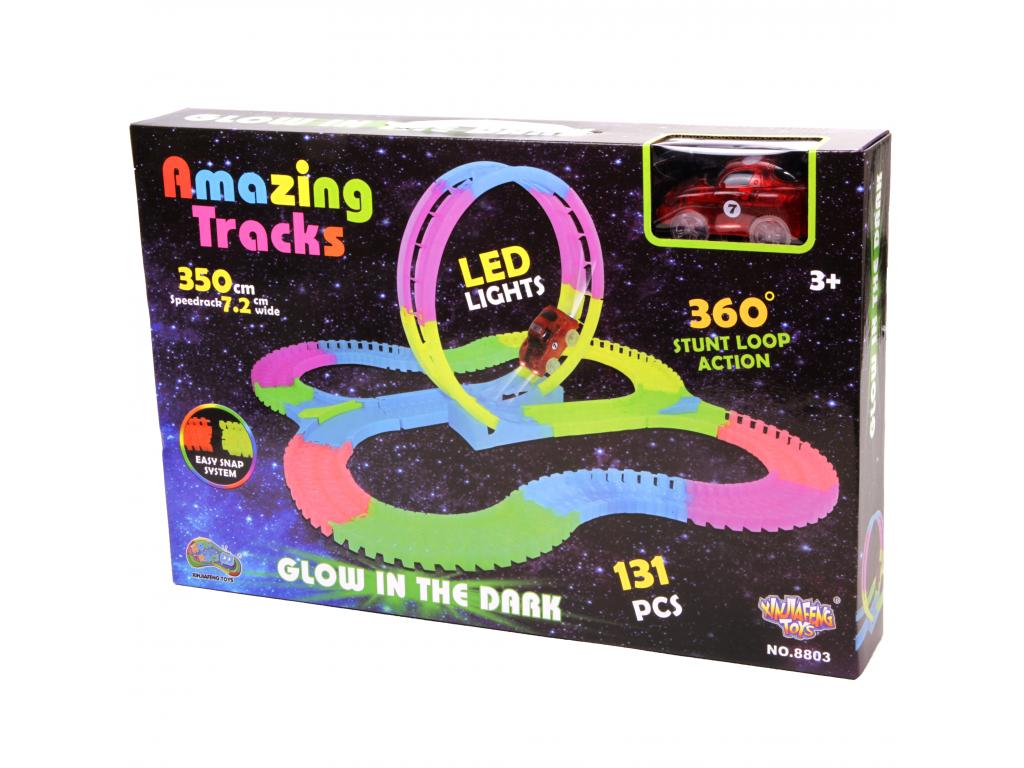 Száguldozz a világító versenyautóval akár éjszaka is! Az Amazing tracks világító autópálya autóval egy 131 darab építőelemből összeszerelhető versenypálya, zöld, rózsaszín, világoskék, lila és sárga részekből. Az autópályát több módon is össze tudod állítani, a sávváltókkal terelgetheted az autót, illetve egy halálkanyarral lehet még izgalmasabbá tenni a versenyt. A pályaelemek világítanak a sötétben, ezért este is lehet vele játszani, az autó menet közben LED fényekkel világít. A játék 2 darab AAA mikro ceruzaelemmel működik, a csomagolás az elemeket nem tartalmazza. Az Amazing tracks világító autópálya autóval pálya méretei: 350 x 7 cm, csomagolás méretei: 48 x 7 x 32 cm.