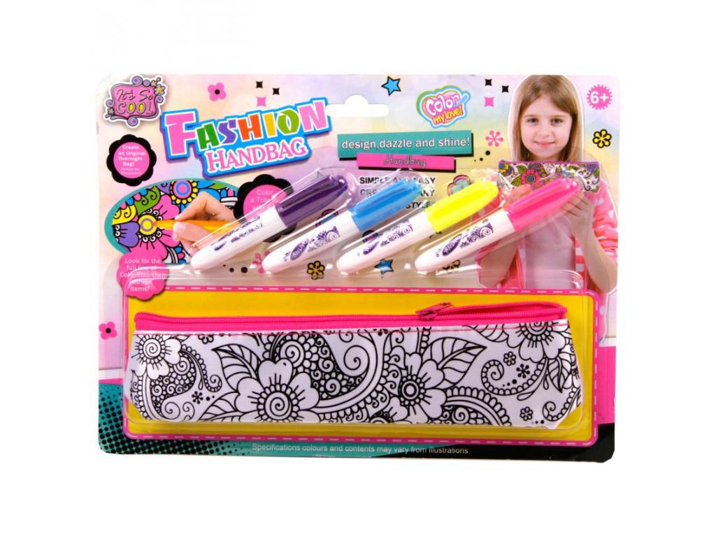 Készíts magadnak egyedi színmintát a tolltartódra! A Kifesthető tolltartó filctollakkal egy hosszúkás, kisebb méretű táska rózsaszín szegéllyel, fekete-fehér mintával. A készletben lévő filctollakkal egyedi színösszeállítást tudsz varázsolni a tolltartóra, amiben a ceruzáid, tollaid, és még egy kicsebb vonalzó is kényelmesen elfér. A tolltartó kimosható, ilyenkor elveszíti a színét, és újra tudod satírozni a mintákat. A Kifesthető tolltartó filctollakkal készlet tartalmazza a filctollakat is. Tolltartó méretei: 22 x 6 cm.