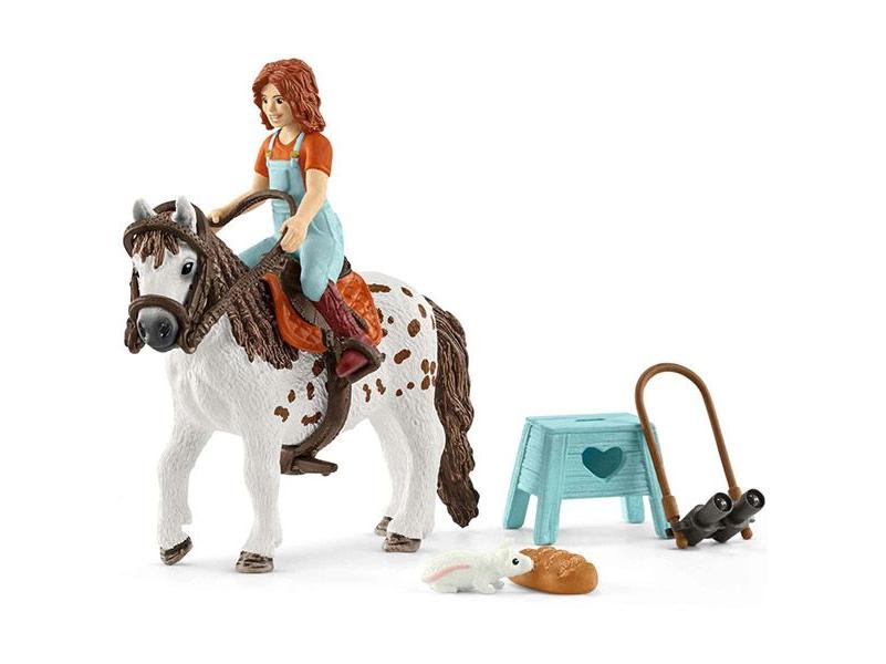 A Schleich: Horse Club - Mia és Spotty készletben helyet kapott Mia és kedvenc lova, Spotty, valamint apró kiegészítők is.