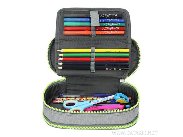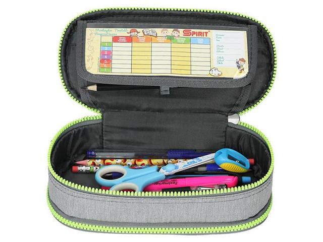 Egészítsd ki gyermeked iskolaszereit egy kiváló minőségű Spirit tolltartóval amely a világos szürke alapszínén neon cipzárokkal rendelkezik és divatos megjelenést kölcsönöz használója számára. Az ovális tolltartó használatával használatával biztonságosan és jól szortírozottan hordhatja magával a fontos írószereket az iskolai mindennapok során. Az emeletes kialakításának köszönhetően rengeteg írószer elférhet a belsejében, 23cm-es hosszából adódóan akár a körző, vonalzó is elfér benne. A tolltartó belsejében különböző gumis rögzítő elemek is megtalálhatók amelyekben színes ceruzákat, filctollakat és egyéb írászereket tárolhat.