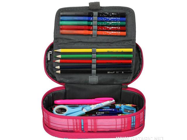 Igazán csajos megjelenéssel büszkélkedhet ez a kiváló minőségű anyagból készült tolltartó, amely az emeletes kialakításának köszönhetően rengeteg írószer tárolására alkalmas. A felső szint belsejében egy kihajtható fül is megtalálható, amely további írószerek tárolására szolgál. A tolltartó 23cm-es méretének köszönhetően akár körző, vonalzó vagy papírvágó olló is elférhet. Különböző gumis rögzítő elemek használatával színes ceruzákat, filctollakat és egyéb írászereket tárolhat biztonságosan gyermeked az iskolai mindennapok során.