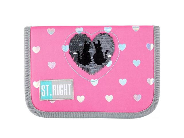 Rózsaszín alapon ezüstös szívek láthatóak ezen a remek tolltartón, mely azonban a flitteres cicás mintájával nyeri el igazán a kislányok tetszését. Az írószerek tárolásában a gumis pántok lesznek segítségükre, ahol azonban a kisebb kiegészítőiket is elhelyezhetik. A St.Right Flitteres cicás mintájú tolltartó kiváló minőségű, így hosszú évekig a gyerekek társa lehet az iskolai tanórákon, nyitása és zárása pedig egyetlen cipzárral megoldható.