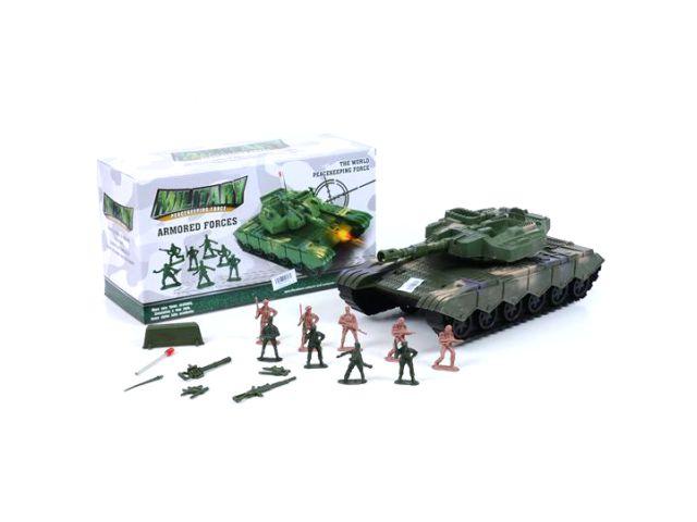 Aki egy vagány harc-játékszettre vágyik, annak biztosan elnyeri majd a tetszését ez a készlet. A csomagban egy jókora, közel 30cm-es tank található, melynek tornya elforgatható és a csöve le-fel mozgatható. A szett tartalmazza még a 9db játékkatonát is, melyeknek öntött talapzata van azért, hogy stabilan megálljanak a talajon. Valamint megtaláljuk benne a kiegészítő fegyvereket, melyek tetszés szerint a katonák kezébe adhatóak vagy a tankra tehetőek. A tank színe terep-zöld álcázófestés.