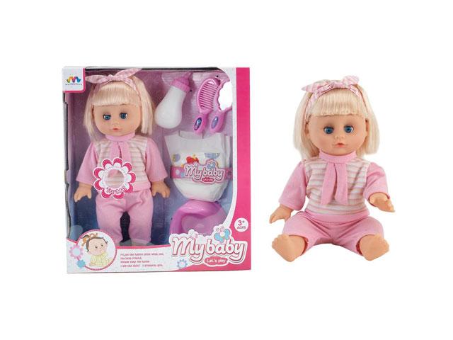 Gyermeked szeretne egy saját babát, amiről gondoskodhat és mindig társa lehet? Ez a baba tökéletes választás lehet számára, hiszen egy több funkciós babáról van szó. A baba szőke hajat, kék szemet és egy aranyos kezeslábast kapott, mely nagyon aranyos megjelenést nyújt neki. Ezen kívül a hasát megnyomva hangot ad, valamint még meg is lehet itatni a szettben lévő cumisüveggel, melyet később aztán ki tud pisilni, így egy bili és egy pelenka is a szett része, gyermeked pedig úgy érezheti, egy igazi kisbabáról kell gondoskodnia. A szettben ezeken kívül még egy fésű és tükör is megtalálható.