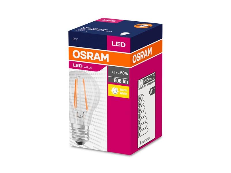 OSRAM Value LED körte, átlátszó üveg búra, 7W 806lm 2700K E27, átlagos élettartam: 10000 óra, fényszín: meleg fehér, sugárzási szög: 300 fok, energiaosztály: A++, fényhasznosítás: 115 lm/W, kapcsolásszám: 100000, kiváltott hagyományos izzó: 60 W, termék hossza: 105 mm, termék átmérője: 60 mm