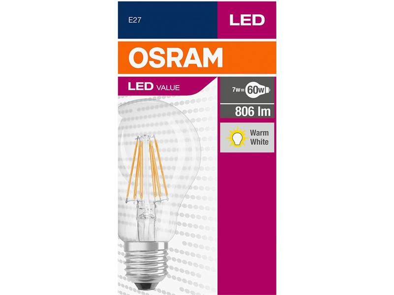OSRAM Value LED körte, átlátszó üveg búra, 7W 806lm 2700K E27, átlagos élettartam: 10000 óra, fényszín: meleg fehér