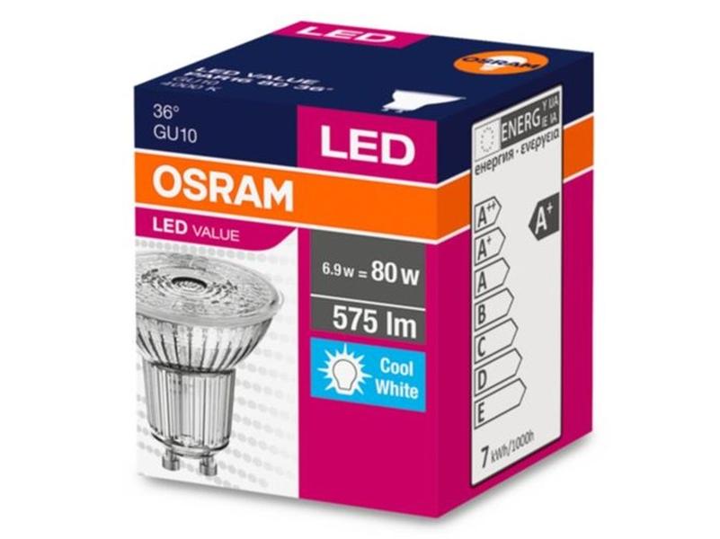 OSRAM Value 230V LED PAR16 spot, üveg ház, 6,9W 575lm 4000K GU10, átlagos élettartam: 10000 óra, fényszín: hideg fehér, sugárzási szög: 36 fok, energiaosztály: A+, fényhasznosítás: 83 lm/W, kapcsolásszám: 100000, kiváltott hagyományos izzó: 80 W, termék hossza: 55 mm, termék átmérője: 51 mm