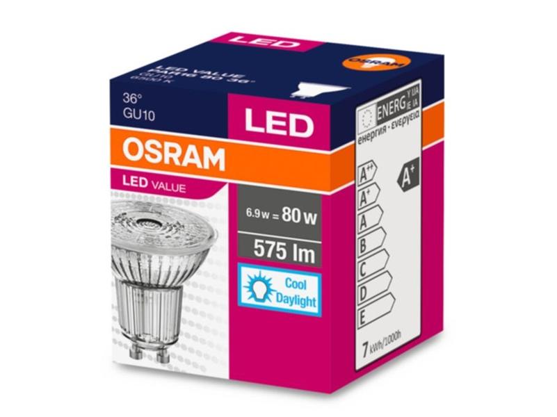OSRAM Value 230V LED PAR16 spot, üveg ház, 6,9W 575lm 6500K GU10, átlagos élettartam: 10000 óra, fényszín: daylight, sugárzási szög: 36 fok, energiaosztály: A+, fényhasznosítás: 83 lm/W, kapcsolásszám: 100000, kiváltott hagyományos izzó: 80 W, termék hossza: 55 mm, termék átmérője: 51 mm