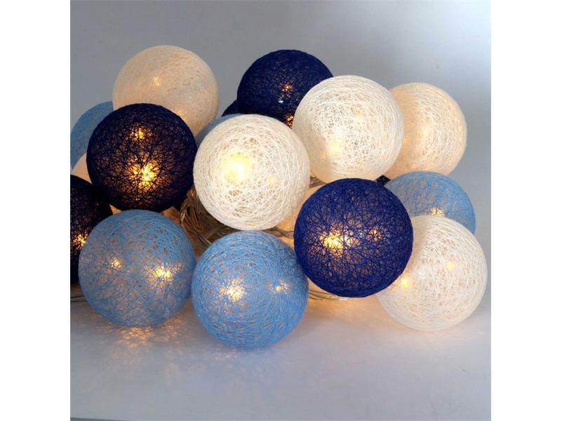 A Gömb alakú 6cm/színes fonott/3m/kék-v.kék-fehér/20db LED-es/USB-s fénydekoráció leírása: