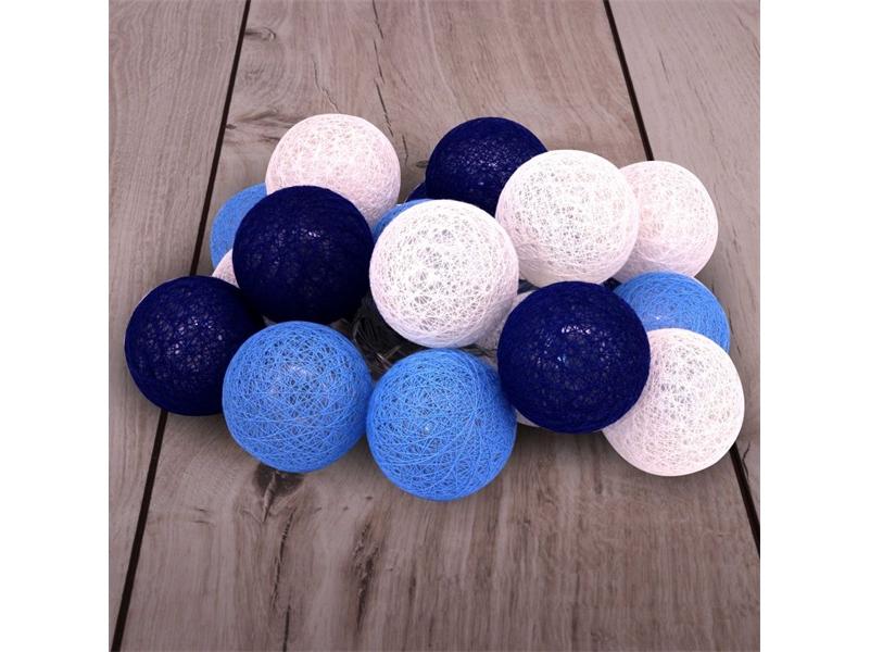 Gömb alakú 6cm/színes fonott/3m/kék-v.kék-fehér/20db LED-es/USB-s fénydekoráció