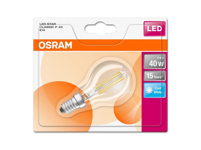 OSRAM Star LED kisgömb, átlátszó üveg búra, 4W 470lm 4000K E14, átlagos élettartam: 15000 óra, fényszín: hideg fehér, sugárzási szög: 300 fok, energiaosztály: A++, fényhasznosítás: 118 lm/W, kapcsolásszám: 100000, kiváltott hagyományos izzó: 40 W, termék hossza: 77 mm, termék átmérője: 45 mm