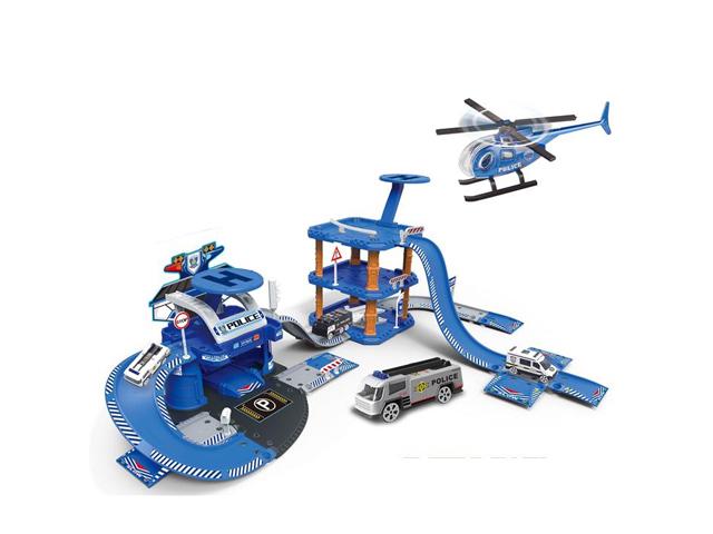 A Rendőrségi kék parkolóház autókkal és helikopter leszállóval leírása: