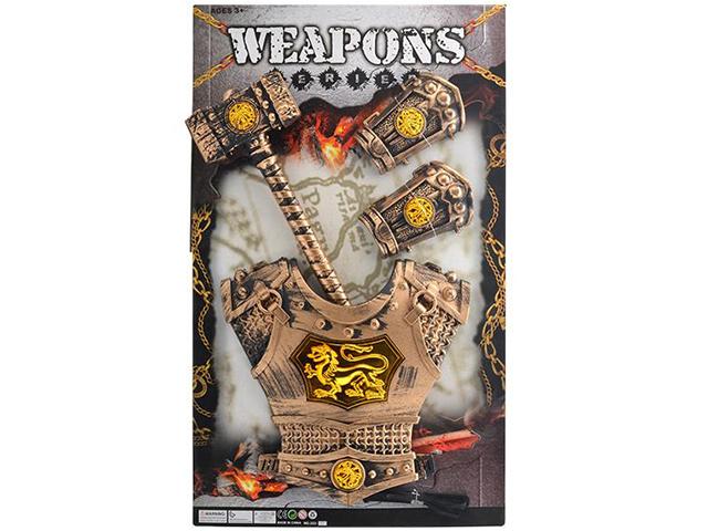 Ebben a 4db-os középkori harcos felszerelés játékszettben gyermeked minden olyan kiegészítőt megtalálhat, amelyek egy vérbeli harcossá varázsolhatják őt egy szempillantás alatt. A szettben részletgazdag kidolgozottsággal rendelkező kalapács, pajzs és kézfej védő is megtalálható amelyek használatával azonnal megkezdheti a játékot. A középkor izgalmas történetei megmozgatják a gyermekek fantáziáját amely készségfejlesztő hatással bír és mozgásra ösztönöz. A szettben található kiegészítők strapabíró műanyagból készültek, a kézfejvédő standard méretű. A hajlékony műanyagból készült kalapács veszélytelen használatot eredményez, így akár már három éves kortól használatba veheti gyermeked újdonsült középkori felszerelését.