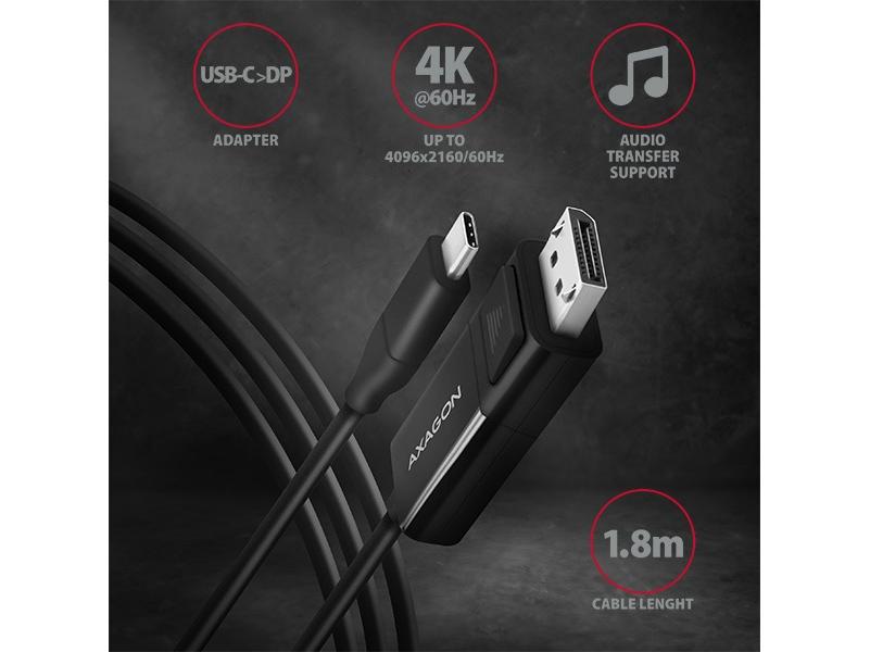 Aktív USB-C -> DisplayPort AXAGON RVC-DPC kábel - adapter, DisplayPort monitor/TV/kivetítő laptophoz vagy telefonhoz való csatlakoztatásához az USB-C csatlakozón keresztül.