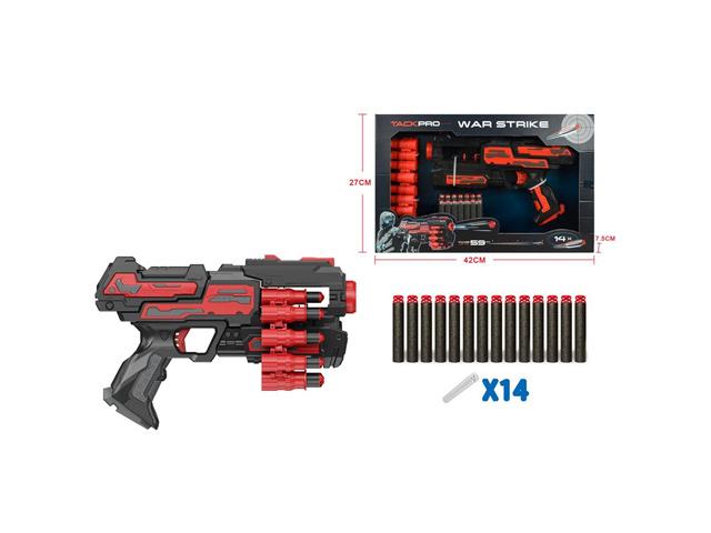 Egy vagány fegyvert szerezhetsz be gyermekednek, ami biztosan elnyeri majd gyermeked tetszését. A fegyver részletes kialakítást kapott, ami a vagány külsőt még különlegesebbé teszi. Fekete és piros színe remekül mutat, ráadásul egyszerre több töltényt is bele lehet tölteni, így nem kell mindig újra tölteni azt. A fegyverben ehhez egy tár is megtalálható, amibe könnyen bele lehet illeszteni a lövedéket, ami nem tud sérülést okozni, így a játék biztonságos lehet. Szerezd be gyermekednek és már kezdődhet is a játék.