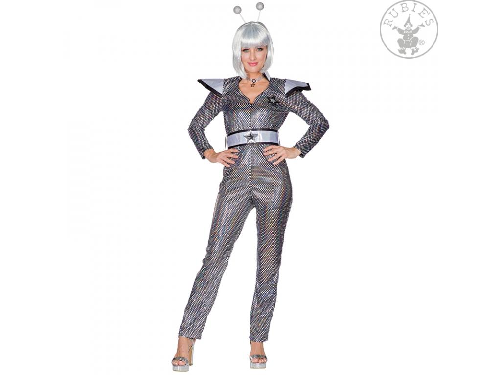 Az Űr overál női jelmez leírása: Fényes, ezüst színű overál, válldísszel és csillag diszítéssel, széles, csillogó szövetövvel, flitteres csillaggal díszítve.