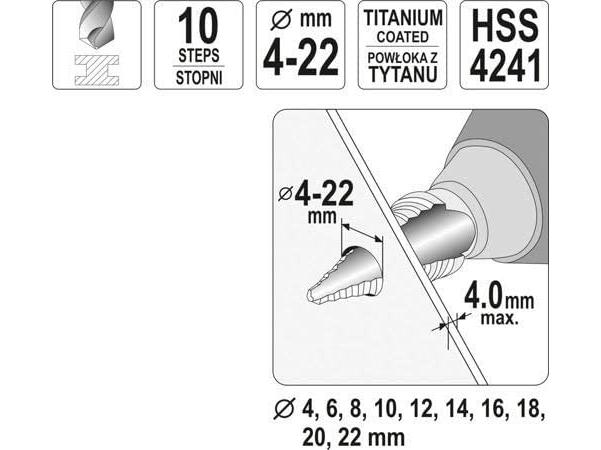 A YATO Lépcsős fúró 4-22 mm HSS Titán-nitrid leírása: