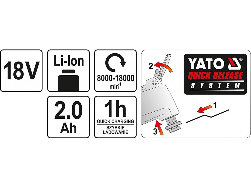 - 18 V-os YATO akkuval működik ( 2 Ah ( YT-82842 ), 3 Ah ( YT-82843 ) és 4 Ah ( YT-82844 ) )
