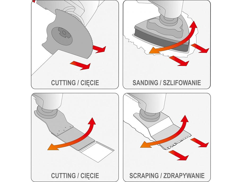 Javasolt javítás, felújítás és felújítás során. Lehetővé teszi a bútordeszkák, az aláfutó ajtók, a vágópanelek és a padlólapok vágását a laminátum, valamint a fém elemek (szögek, csavarok) károsodása nélkül. Vágáshoz, süllyesztéshez fúrás nélkül, köszörüléshez nehezen hozzáférhető helyeken, valamint vakolatok, esztrich, ragasztók és festékbevonatok eltávolításához használják.