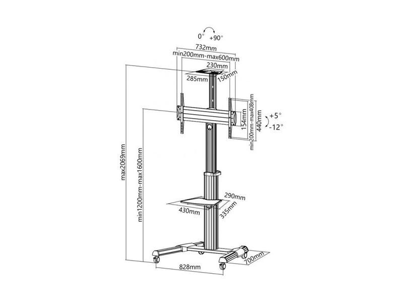 Képernyőméret: 37"- 70"/ 92 - 178 cm, VESA: 200x200, 400x200, 300x300, 400x400, 600x400, Súlykapacitás: 50 kg-ig, Függőleges dőlés: + 5° - 12°, Forgatás: 0-90°, Állítható magasság: 1200 - 1600 mm