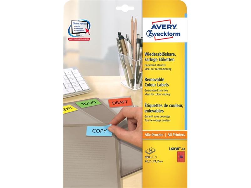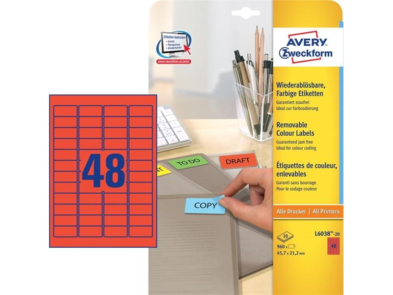 Az Avery L6038-20 45,7x21,2mm visszaszedhető 960db-os piros etikett leírása: