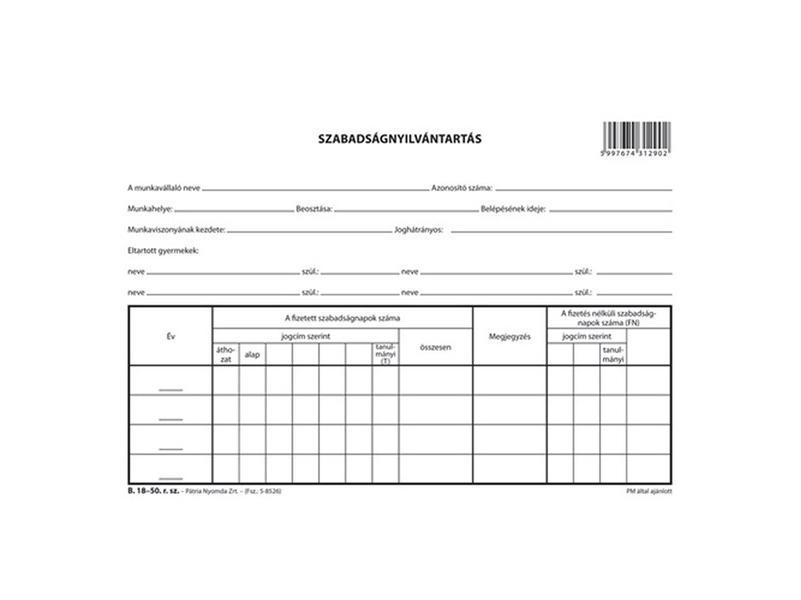 A B.18-50 A5 fekvő szabadságnyilvántartás leírása: