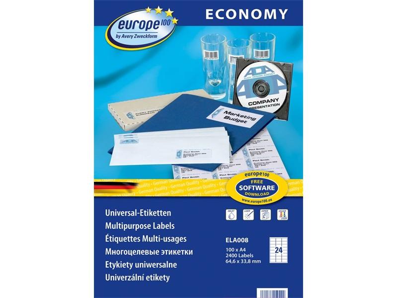 Az Avery Europe100 ELA008 64,6x33,8mm univerzális 2400db-os etikett leírása: