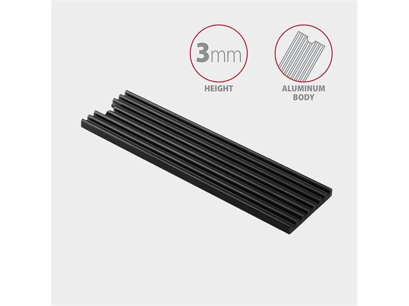 Az univerzális passzív hűtőborda M.2 kártyákhoz használható, mérete 22 x 80 mm. Két mellékelt hővezető párna lehetővé teszi a hűvösebb működést az összes egyoldalas és kétoldalas M.2 SSD lemezhez.