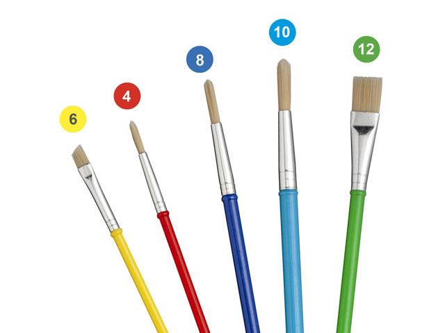 Ez az ecset készlet remek választás az iskolai rajz és művészettörténet órákhoz, hiszen a csomagban öt darab különféle ecset található, melyek mind vastagságban, mind a sörte formájában is eltérést mutat, így alkalmas a különféle technikák elsajátítására. Az ecsetek műszálas sörtéje nem csak ellenálló és strapabíró, hanem a puhaságának köszönhetően igazán szépen lehet velük felvinni a színeket a rajzlapra vagy festővászonra. Az öt ecset nem csak a sörtéjében, hanem színben is eltér egymástól, hogy a gyerekek könnyebben meg tudják őket különböztetni.