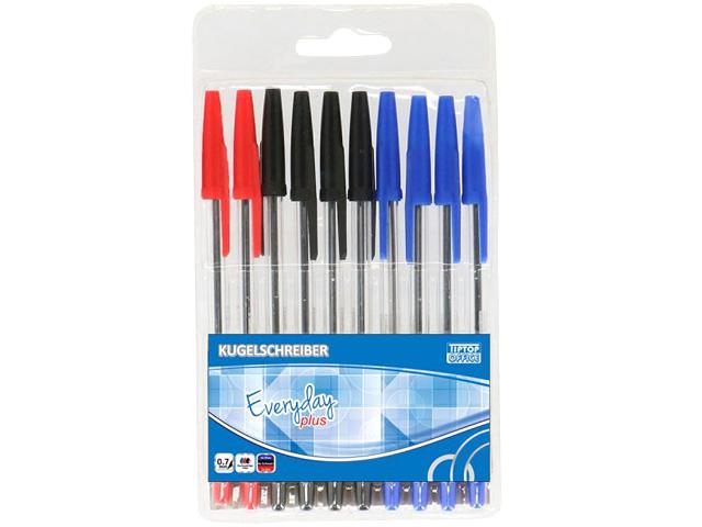 Iskolai, irodai és otthoni használatra is remek választás ez a golyóstoll szett, mely klasszikus formavilággal és három különböző színnel érkezik. A műanyag tárolóban összesen 10db golyóstoll kapott helyet, melyek között 4db kék, 4db fekete és 2db piros tintával töltött tollat találunk. A tollak a tintaszínnel megegyező kupakkal ellátottak, ami megvédi őket a sérülésektől és a kiszáradástól. A tollak 1mm-es hegyvastagsággal rendelkeznek.