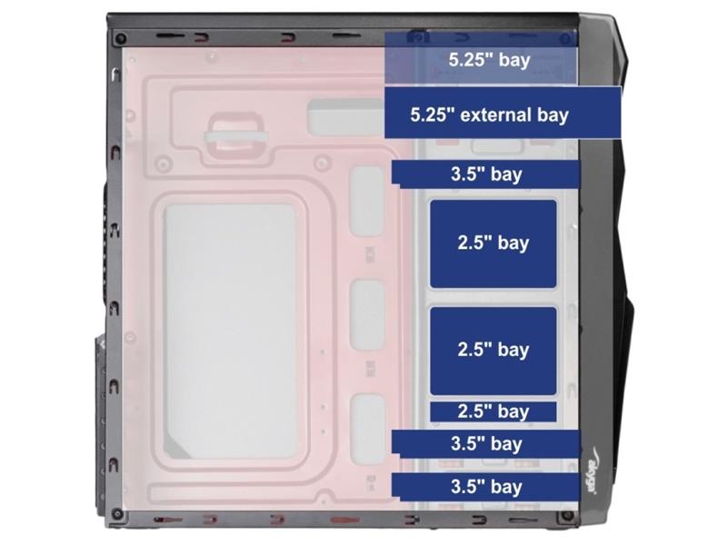 A felső 5,25 "-os külső rekeszben egy CD / DVD-meghajtó vagy egy égő csatlakoztatható, amelyen belül három 2,5" -os, három 3,5 "-es 2,5" -es mélyedés és egy 5,25 "-es öböl helyezkedik el. lemezek és meghajtók A kábelvezető rendszer megkönnyíti az összetevők telepítését, míg a tágas belső tér 385 mm hosszú hosszú grafikus kártyákat tesz lehetővé.