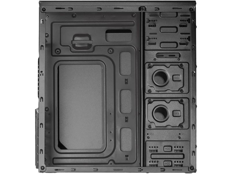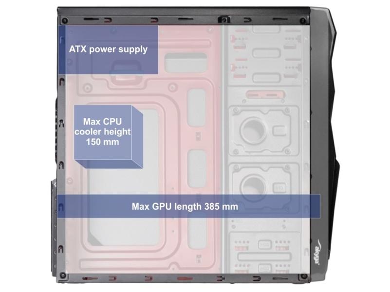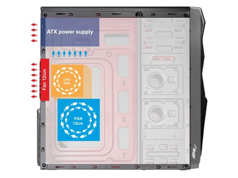 Az eset lehetővé teszi két ventilátor felszerelését: az oldal (12 cm) és a hátsó (12 cm). A CPU hűtési rendszer maximális magassága 150 mm. Az előlapon két USB 2.0 található, amelyek kiválóan alkalmasak vezeték nélküli egerek, billentyűzetek, külső adathordozók vagy egyéb eszközök csatlakoztatásához. A fejhallgató és a mikrofon bemenetek közvetlenül a közvetlen közelében találhatók, így a perifériák gyors és egyszerű hozzáférést biztosítanak.