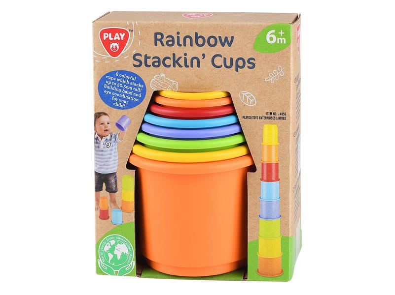 A szivárvány színekben pompázó, műanyag poharak minden kisgyermek kedvence lesz. Használata sokrétű, így elengedhetetlen kelléke a játéktárnak. A kicsik rakosgatás közben megtanulhatják a színeket, állatokat, fejlődik a szem-kéz koordináció, finom-motorika és a probléma megoldó készségük is. A poharak egymásba rakhatóak, csökkenő sorrendben pedig torony is készíthető belőlük, valamint fürdőjátéknak is tökéletes. A játék újrahasznosított műanyagból készült a környezettudatosság jegyében. A csomag 8 db poharat tartalmaz.