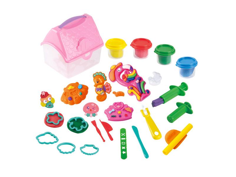 Ez a praktikus, rózsaszín házikó és egyben gyurma tároló egy elvarázsolt világot hoz el a kislányoknak! A formázók és sablonok segítségével a legszínesebb és legérdekesebb alkotások készülhetnek el. A rengeteg kiegészítő lehetőséget ad, hogy a kibontakozzon a kreativitás és szórakozás mellett a kézügyessége is fejlődjön a gyerekeknek. A házikó 4 tégely, színes gyurmát, korona és flamingó sablonokat, kiegészítőket és formázókat is tartalmaz. Gyúrjad, gömbölyítsd, szúrd ki majd díszítsd fel egyedi alkotásod, hiszen az elvarázsolt világban a képzeletnek nincs határa!