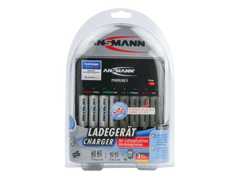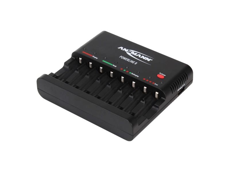 ANSMANN akkumulátortöltő 8x AA / AAA NiMH akkumulátorok töltéséhez és kisütéséhez - 8-utas akkumulátortöltő egyedi nyílásfigyeléssel, automatikus kikapcsolással, csepegtető töltéssel és USB-töltővel - Powerline 8