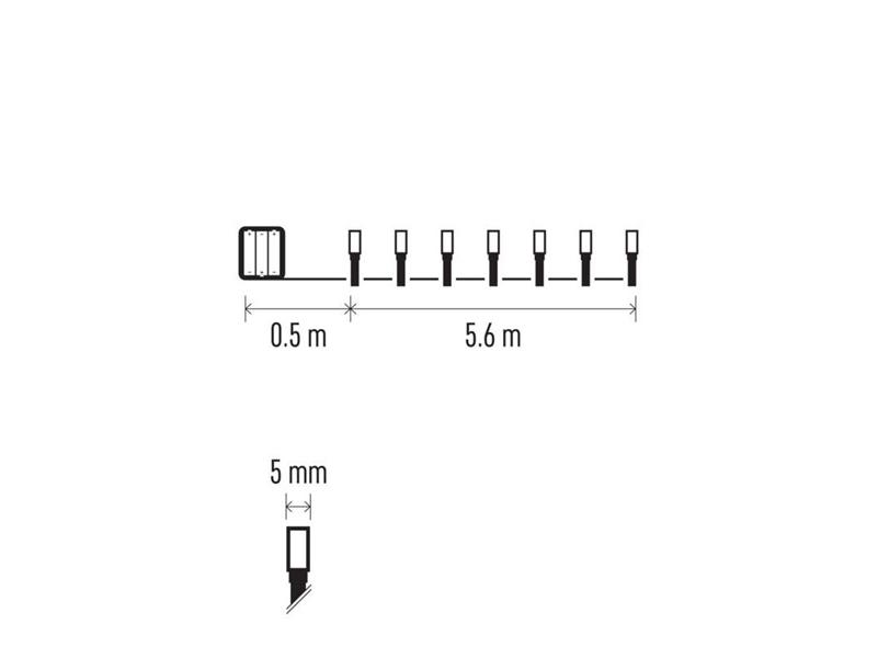 termék: lánc, fény színe: meleg fehér, méretek: 5,6 m, használat: kültéri és beltéri, időzítő, távvezérlő: nem, funkció: világít, tápellátás típusa: elem (3× AA), forma: klasszikus, LED-ek száma: 80, LED-ek közötti távolság: 7 cm, LED mérete: 5 mm, tápvezeték hossza: 0,5 m, a fa magasságához: nincs megadva, kábel színe: fekete, fogyasztás: 0,9 W, kimeneti feszültség: 4,5 V DC, csatlakoztatási lehetőség: nem, védettség: IP44, élettartam: 10 000 óra, anyag: PVC, garancia-időszak: 2 év, értékesítési csomagolás: 1 db, doboz