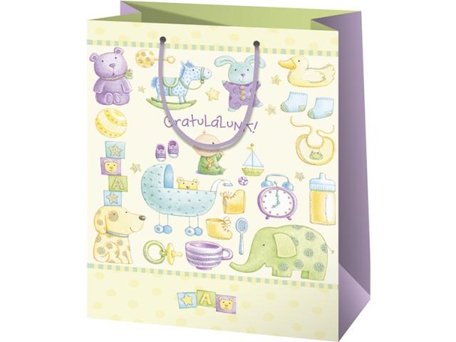 Babaváró bulikra az ajándékok átadására remek választás ez a különleges "Gratulálunk!" felirattal ellátott ajándéktáska. A Cardex kiváló minőségű ajándéktáskái erős zsinór fülekkel és erősített talprésszel készülnek, hogy a nehezebb ajándékokat is könnyen és biztonságosan lehessen bennük szállítani. A táska felülete laminálással van ellátva, mely nem csak a szennyeződésektől és a nedvességtől védi a papír alapanyagot, de a táskán látható mintát is még szebbé és hangsúlyosabbá teszi.
