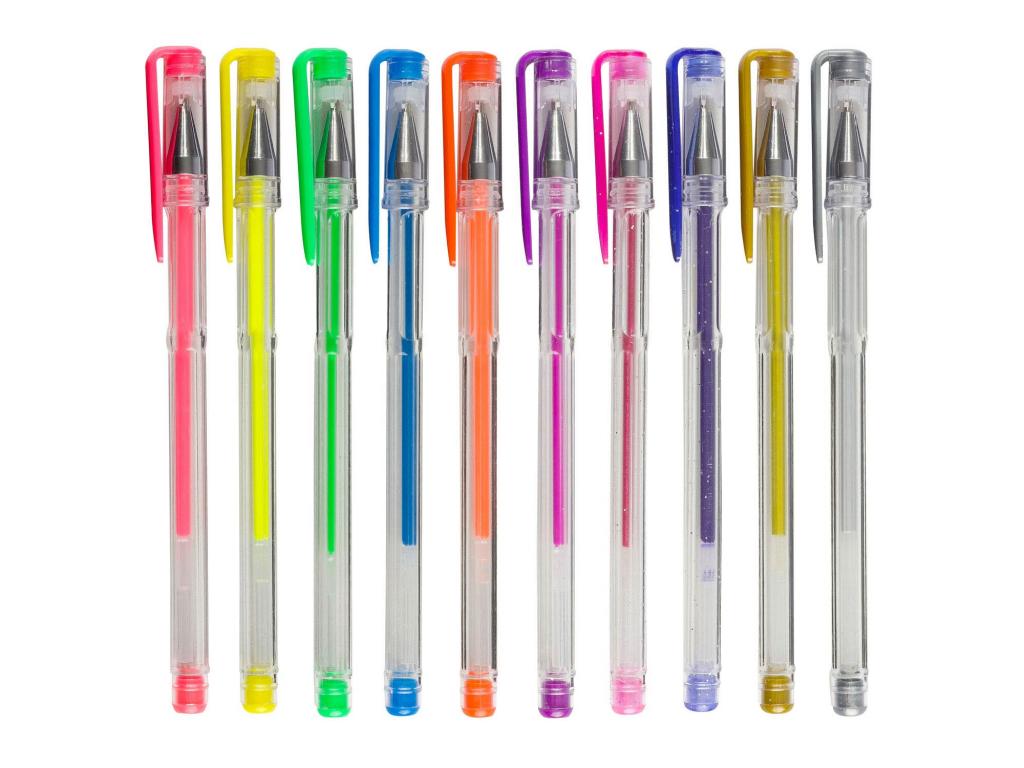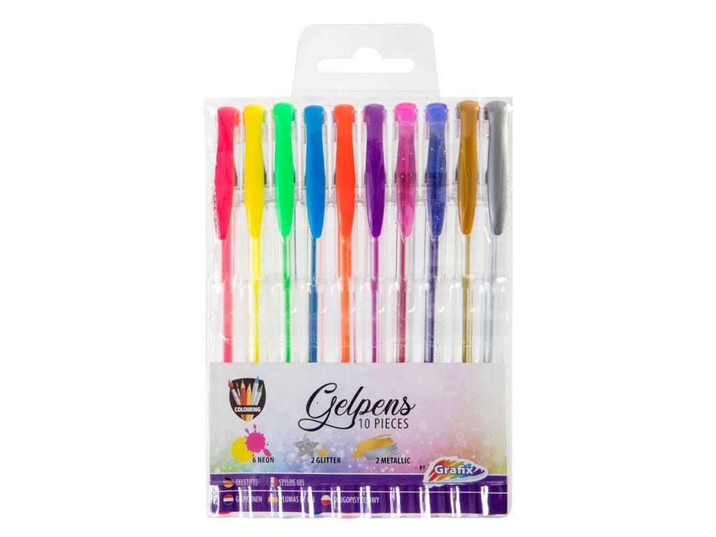 A csomag 10 db különböző színű zselés tollat tartalmaz, 6 normál, 2 csillogós és 2 db metál színűt.