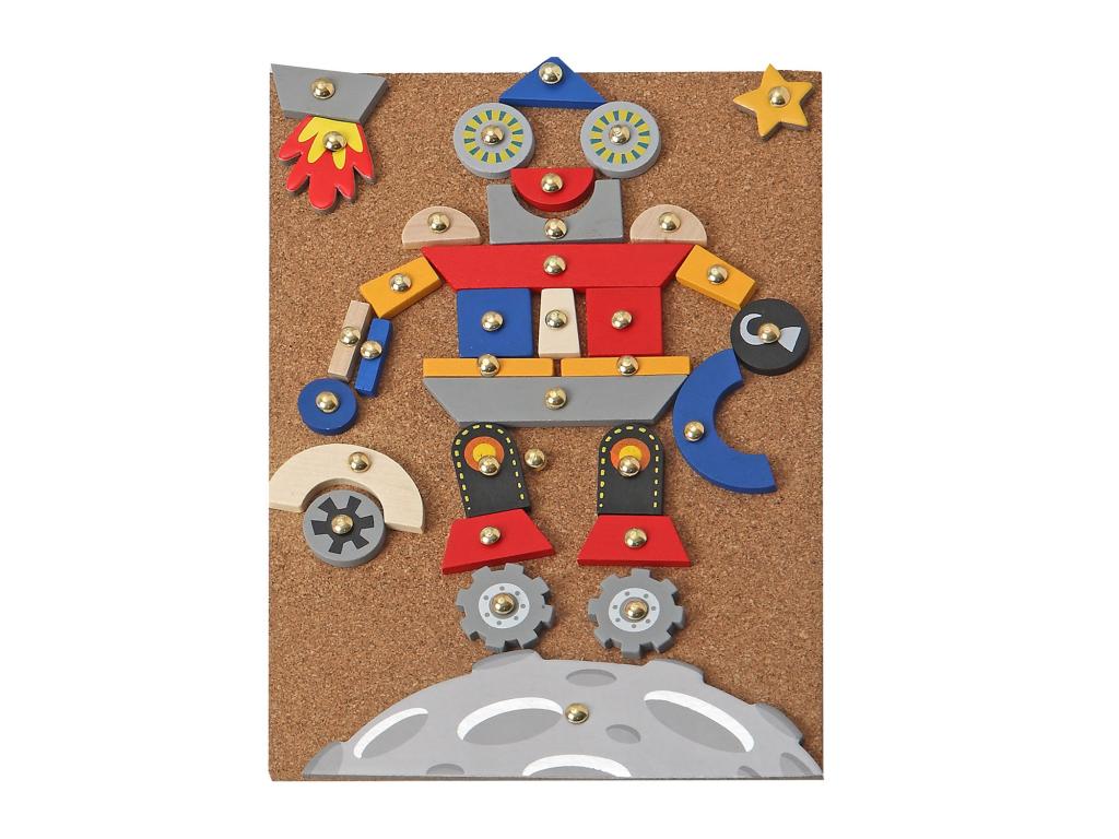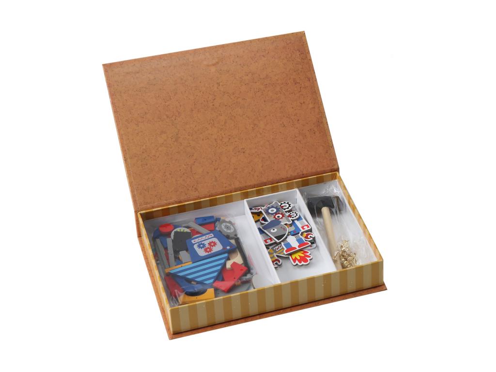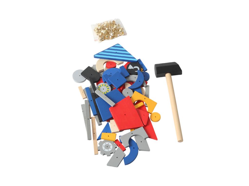 A dobozban található parafa alaplapra lehet a kalapáccsal a kis szögeket és fa formákat rákalapálni, ezzel különböző mintákat, képeket létrehozva.