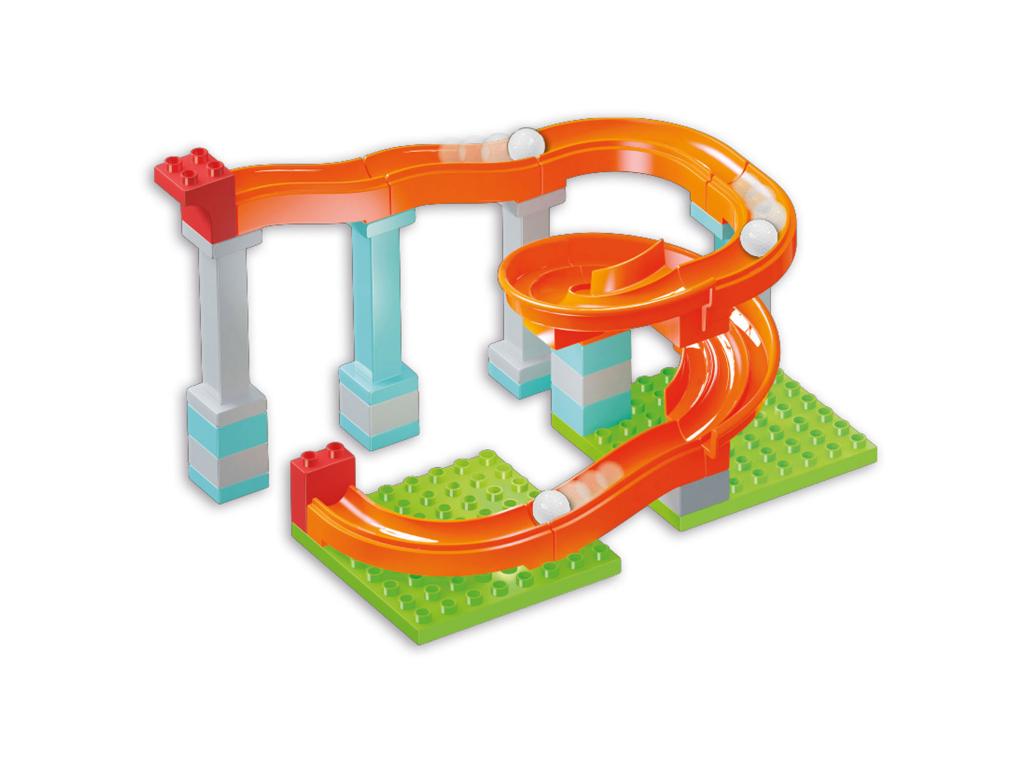 A 31 darabos, élénk színű elemekből és golyókból álló készlet lehetővé teszi a gyermekeknek, hogy elképzelésük szerint építsék meg a pályát, és a legszórakoztatóbb teremtsék meg a golyóknak.