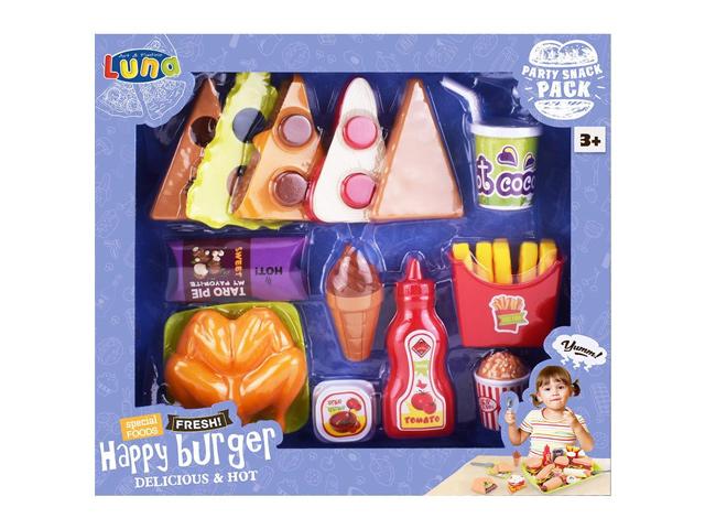 Gyermekjátékaink közül most egy étel szettet hoztunk el gyermekednek, mely biztosan elnyeri majd a tetszését gyermekednek. A szettben különböző gyorséttermi ételek találhatóak meg, mint például sültkrumpli, szendvics, sültcsirke, édességek és pite. Ezen kívül más kiegészítők is vannak a csomagban, melyekkel még többet játszhat majd. Gyermeked felveheti a rendeléseket és aztán ki is szolgálhatja a vendégeket, de akár ő maga készítheti el a különböző ételeket a konyhában.