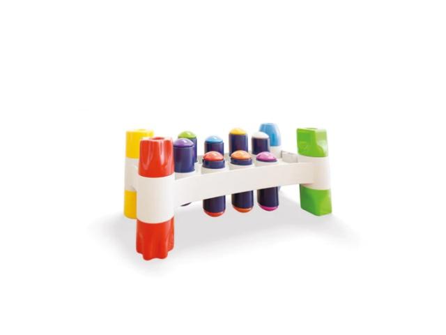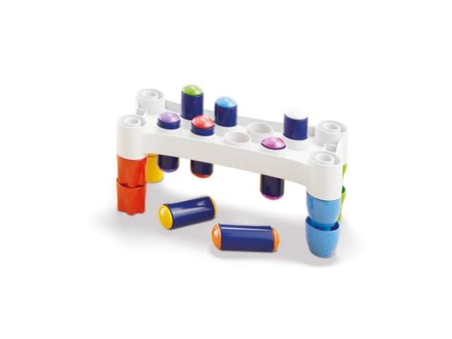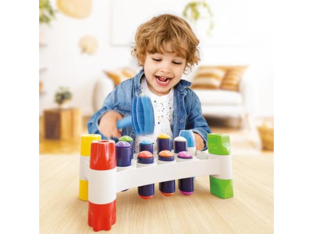 Akár már másfél éves kortól használhatják a gyerekek ezt a különleges kalapácsos ügyességi játékot, melyben az a cél, hogy a különböző színű felső résszel ellátott szögeket kiüssék az állványból. A jópofa játék nem csak, hogy remek szórakozást nyújt majd a kicsiknek, de egyben fejleszti kézügyességüket, finom motoros mozgásukat és térlátásukat is. A csomag tartalmazza az állványt, a szögeket és a kalapácsot is.