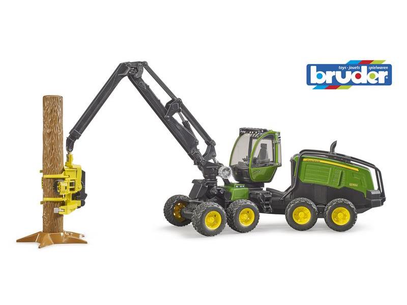 A John Deere fakitermelő gépek már komoly hagyományokkal rendelkeznek az erdei munkákban. A G-sorozatú fakitermelő gépeket a maximális hatékonyság és a nehéz erdei terepeken való munka jellemzi. A 1270G kivitel a 8 kerekével maximálisan stabil, amelyek segítségével szinte nincs olyan terep, amelyet ne tudna leküzdeni. A gép fülkéje 360°-kal elforgatható, az ajtaja nyitható, és kompatibilis a Bruder figurákkal. A lengő futóművek segítségével a legnehezebb tereppel is megbirkózik. A fakitermelő fej egy minden szükséges irányba mozgatható gémre van felszerelve. Az egységen mozgatható a fafogó, a fa előtolás és a fűrész is. A gyerekek azonnal megkezdhetik a fakitermelést, a géphez levehető gyökérrel ellátott farönk is tartozik. A készlethez javasoljuk erdei munkásfigura megvásárlását is.