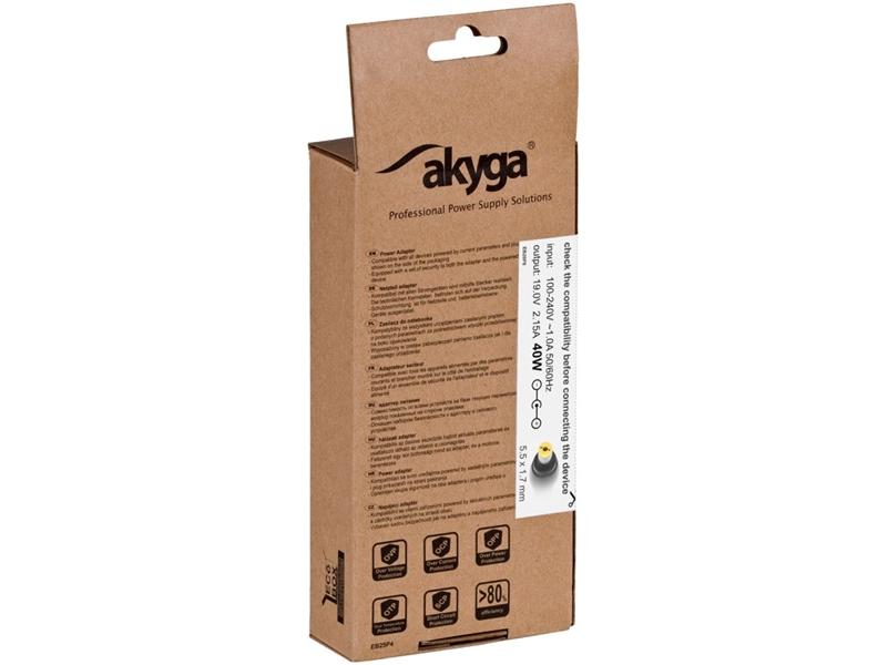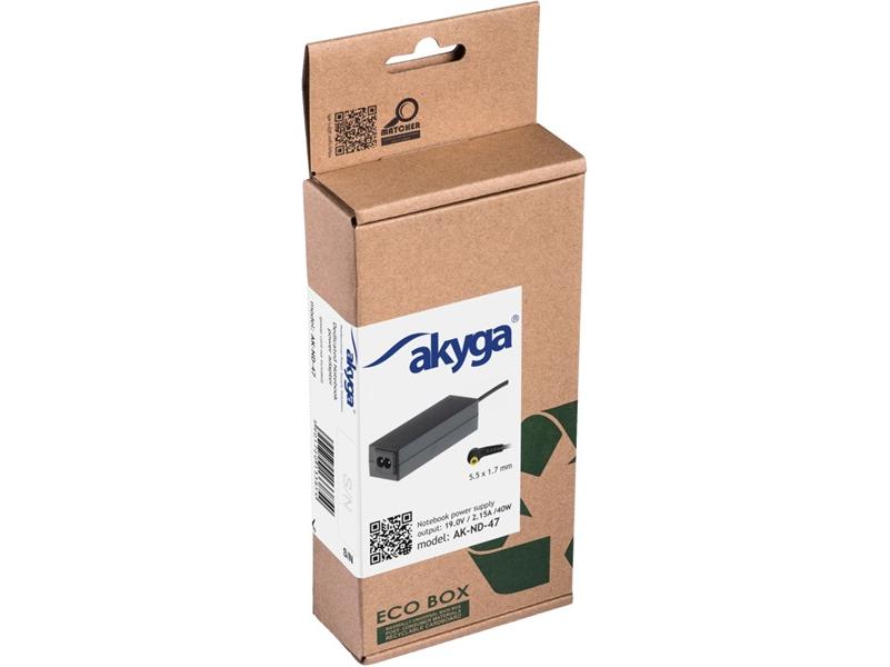 Az AkygaŽ AK-ND-47 egy 19V/2.15A, 40W és 5.5*1.7 mm-es csatlakozóval ellátott notebookokhoz szánt tápegység.