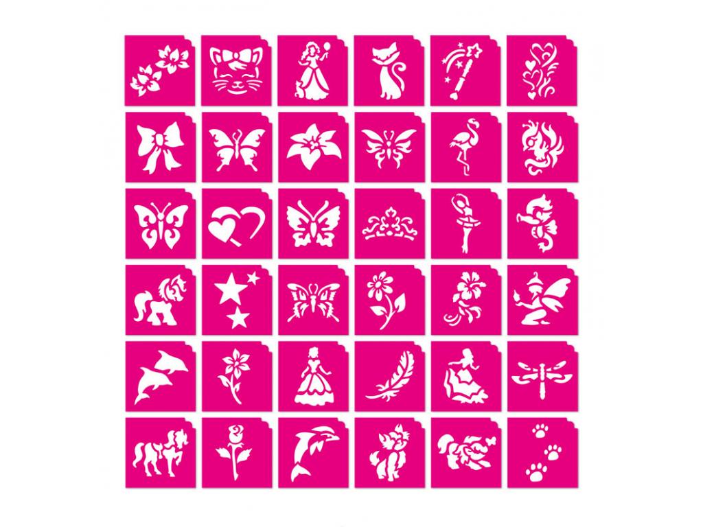 A gyermeked imádott lányos sablonjait festheti meg három egyszerű lépésben. Helyezzük a sablont arra a testrészre, ahova szeretnénk a csillámtetoválást, fessük meg, húzzuk le a sablont. És készen is vagyunk.